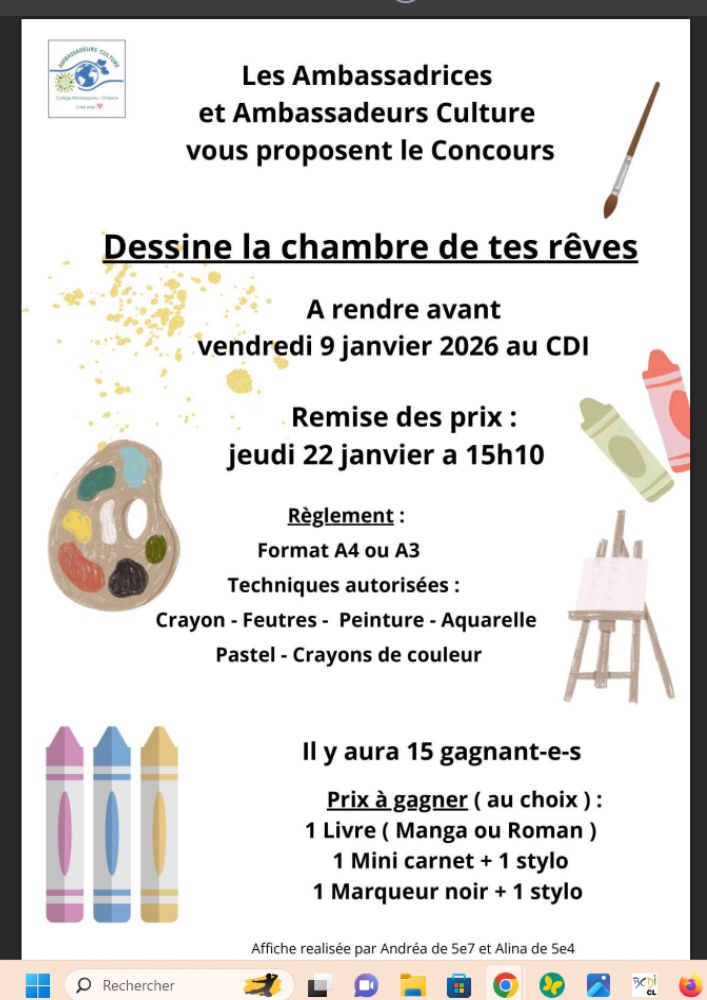 La remise des prix aura lieu au CDI jeudi 22 janvier 2026 à 15h10 (récréation).